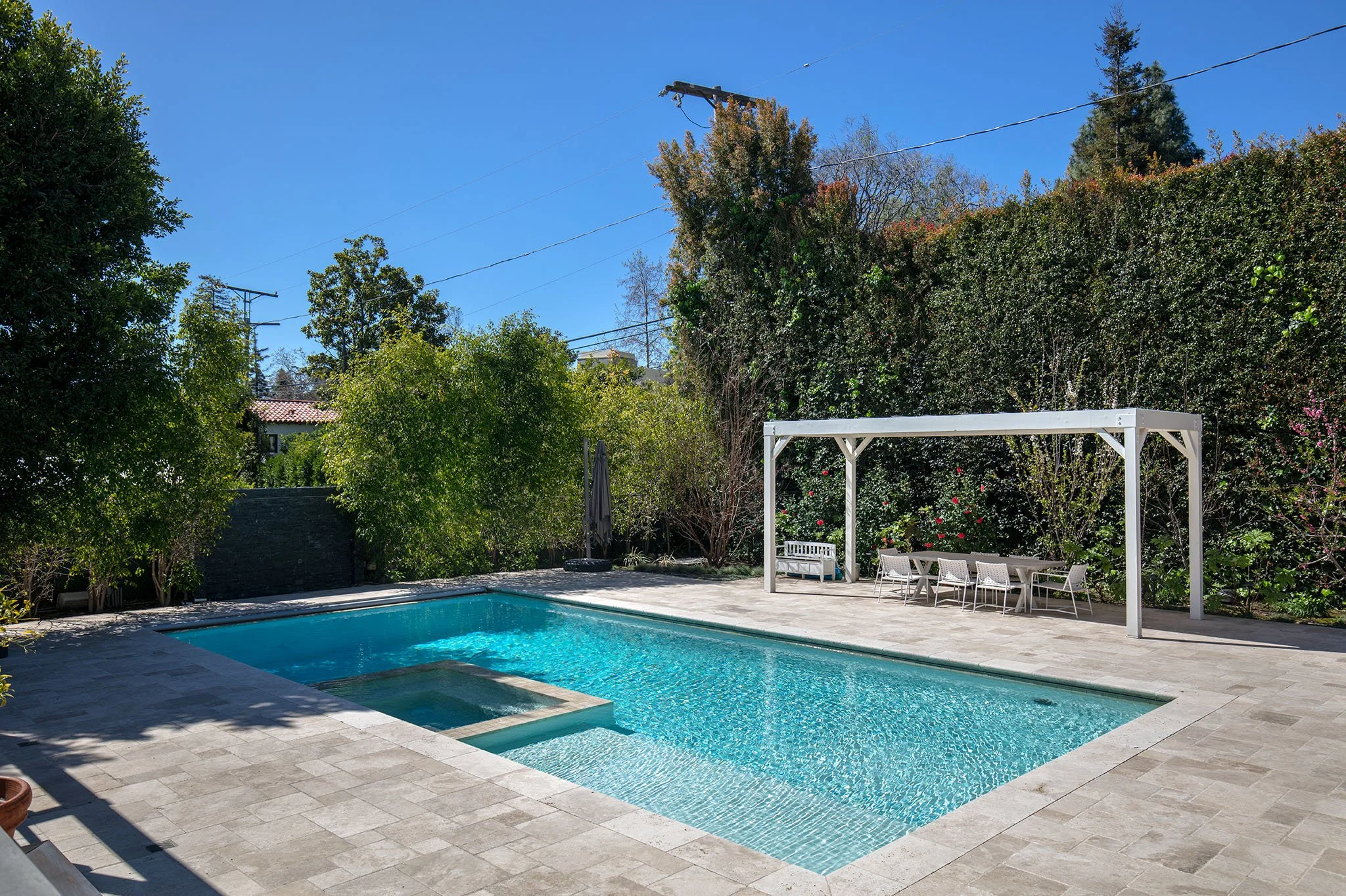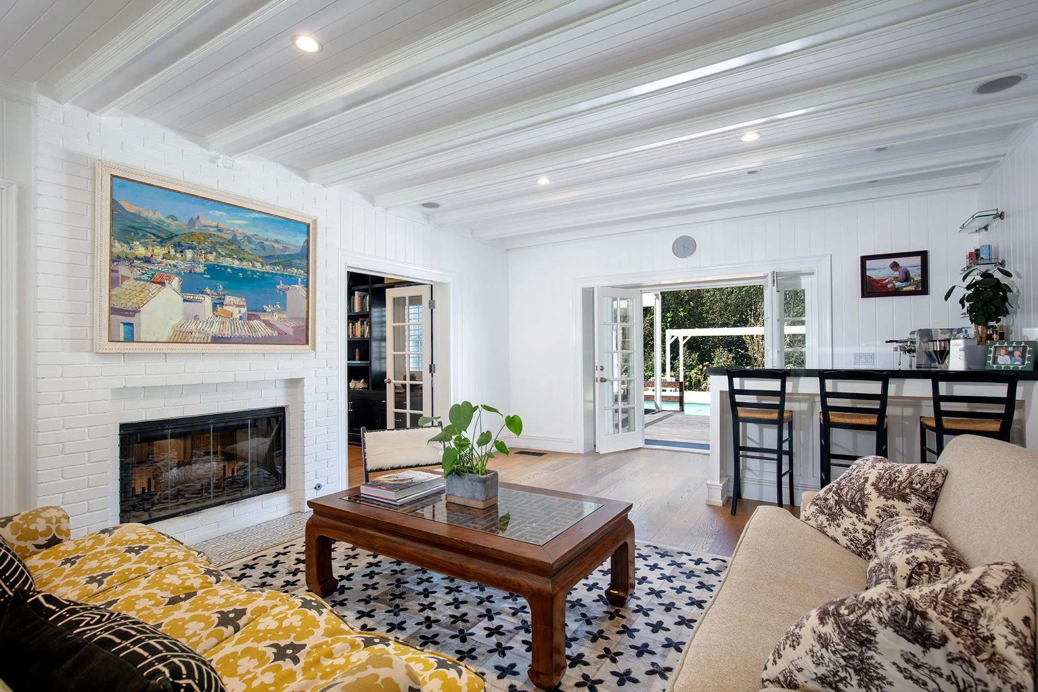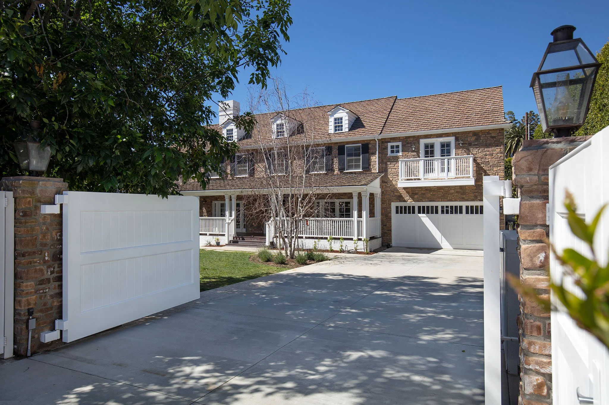 Captivating New England Stone Farmhouse on a large, flat, sunny lot on extremely desirable and quiet Chadbourne Avenue in prime Brentwood Park. Located south of Sunset in close proximity to the Brentwood Country Mart and tucked away behind a tall hedge with great privacy, this well-detailed, sun-filled home has been expanded and remodeled by the current owner with the great taste, quality and attention to detail. Wonderful street presence, open floor plan, sun-filled spaces, extensive millwork and French doors throughout that open to large front porch, grassy yard, pool, spa and outdoor living areas. Main level includes an inviting entry, open cook's kitchen/dining area, living room with bar, den/office, a large, open family room with pocket sliders and fabulous gym - all of which open to the garden. Upstairs consists of a second family room and five bedrooms, including a primary suite with lavish bath and large walk-in closet. Lower level includes a guest bedroom and media room/game room. Hardwood floors, mouldings, paneling, wainscoting and refined Traditional detailing throughout. A warm, inviting "happy" home on a spectacular lot on one of the Westside's very finest streets. Available furnished or unfurnished for one or two years beginning early-to-mid July.