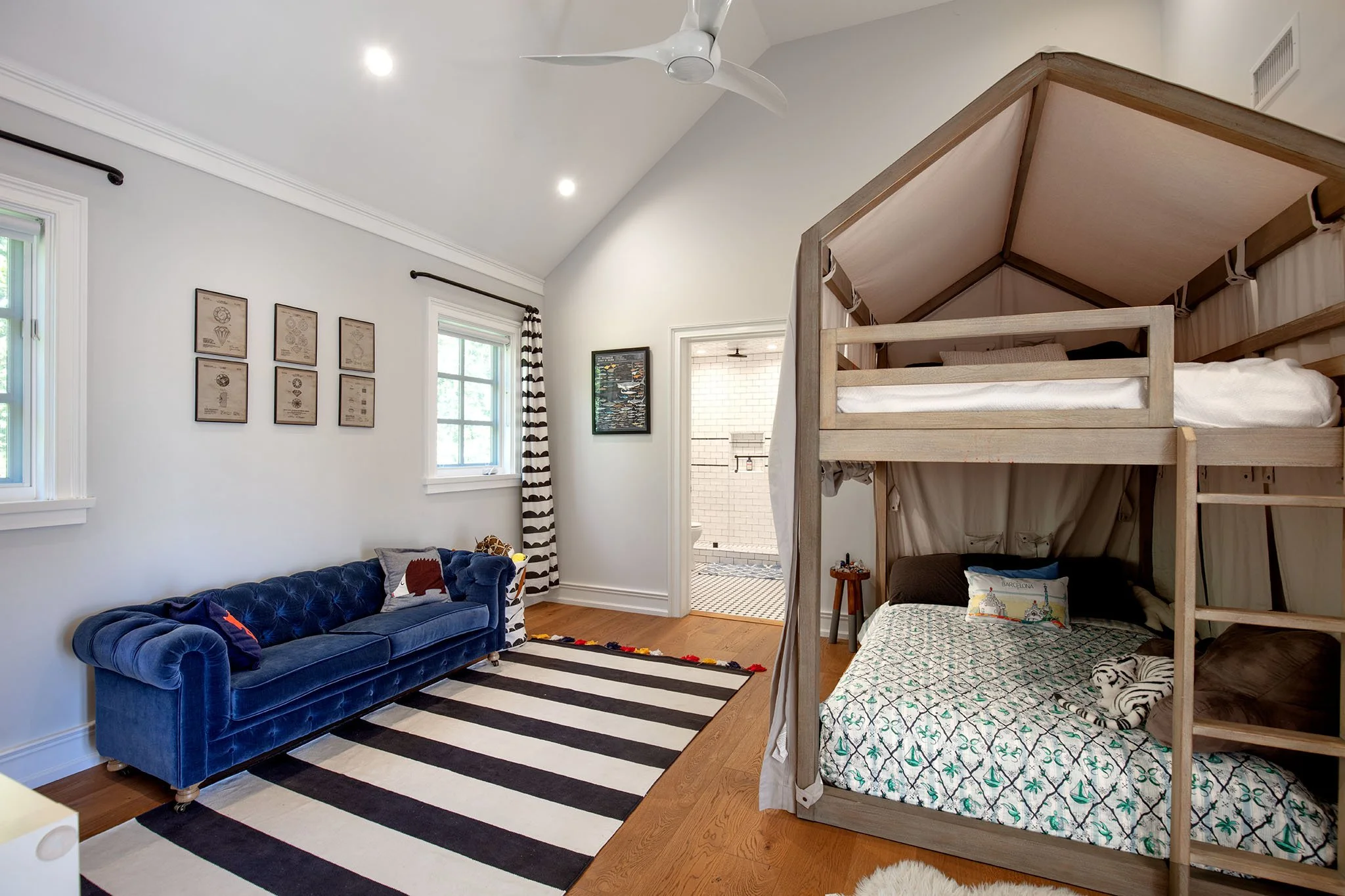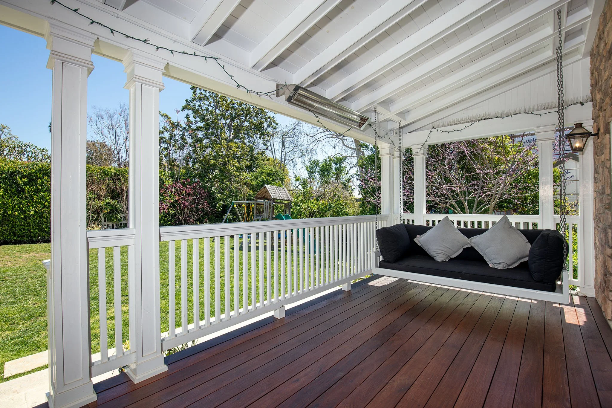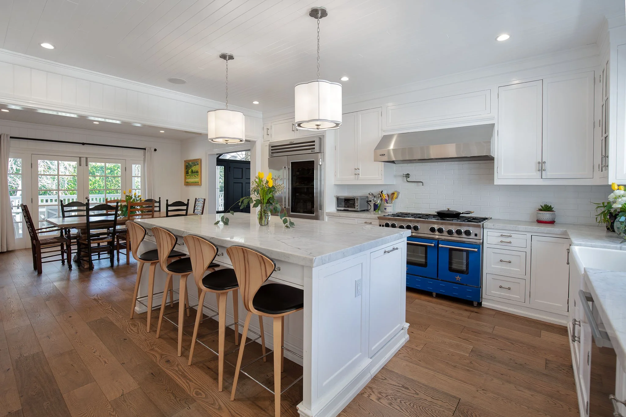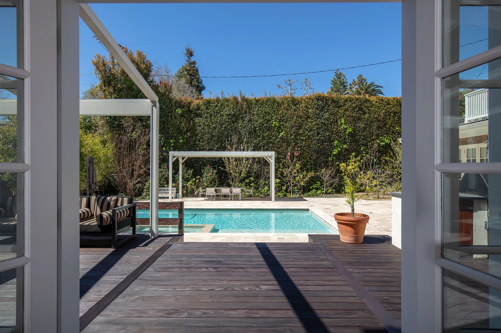 Captivating New England Stone Farmhouse on a large, flat, sunny lot on extremely desirable and quiet Chadbourne Avenue in prime Brentwood Park. Located south of Sunset in close proximity to the Brentwood Country Mart and tucked away behind a tall hedge with great privacy, this well-detailed, sun-filled home has been expanded and remodeled by the current owner with the great taste, quality and attention to detail. Wonderful street presence, open floor plan, sun-filled spaces, extensive millwork and French doors throughout that open to large front porch, grassy yard, pool, spa and outdoor living areas. Main level includes an inviting entry, open cook's kitchen/dining area, living room with bar, den/office, a large, open family room with pocket sliders and fabulous gym - all of which open to the garden. Upstairs consists of a second family room and five bedrooms, including a primary suite with lavish bath and large walk-in closet. Lower level includes a guest bedroom and media room/game room. Hardwood floors, mouldings, paneling, wainscoting and refined Traditional detailing throughout. A warm, inviting "happy" home on a spectacular lot on one of the Westside's very finest streets. Available furnished or unfurnished for one or two years beginning early-to-mid July.