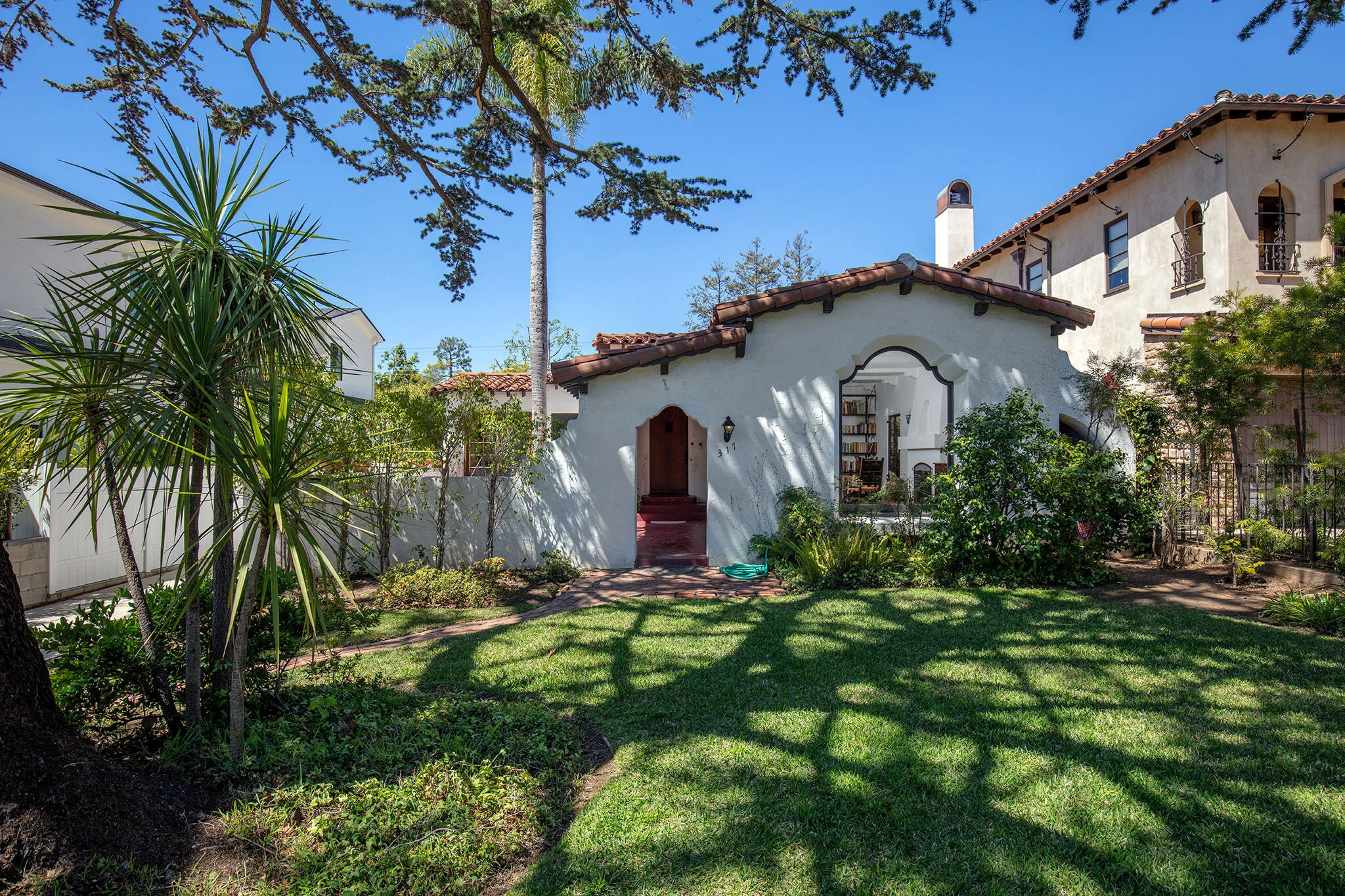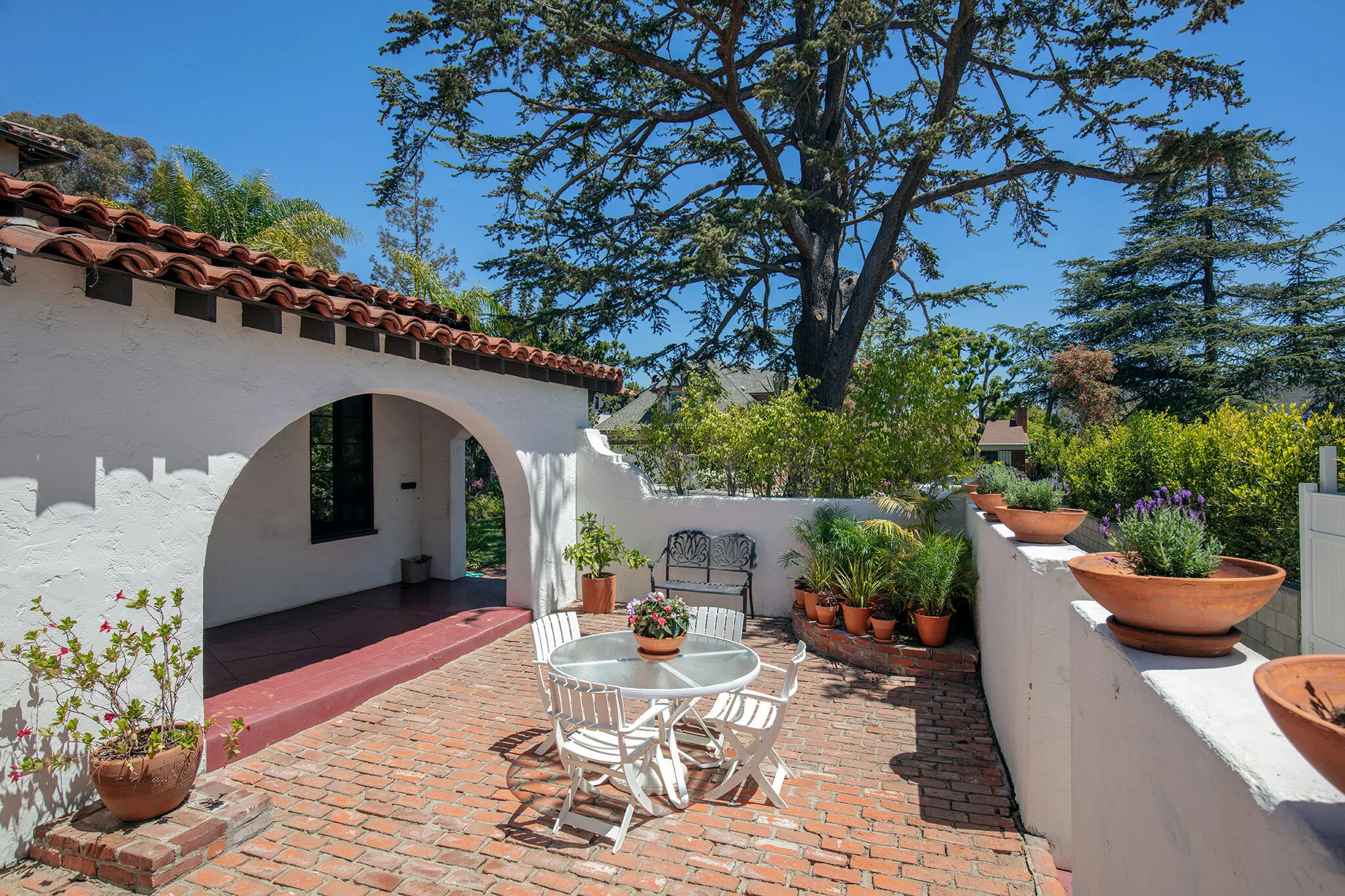 Set off the street under the canopy of a gorgeous old growth evergreen tree lies this 1930 courtyard Spanish. Situated on the desirable, sunny, westside of the street, midway between San Vicente and Sunset, in a highly desirable Brentwood flats location, this classic home possesses wonderful character & charm throughout and features all the signature elements of the period: hardwood floors, plaster walls, coved ceilings and arches, original stained wood windows, built-ins, hardware, light fixtures and beautiful tile work. Welcoming entry with original Magnesite floors leads to step-down living room with tall beam ceiling, fireplace & picture window, and formal dining room. Kitchen with sunny breakfast room opens to walled front courtyard. Three bedrooms and two baths. Large private yard. Rare opportunity to expand, remodel, or restore a classic piece of architecture in the heart of Brentwood.